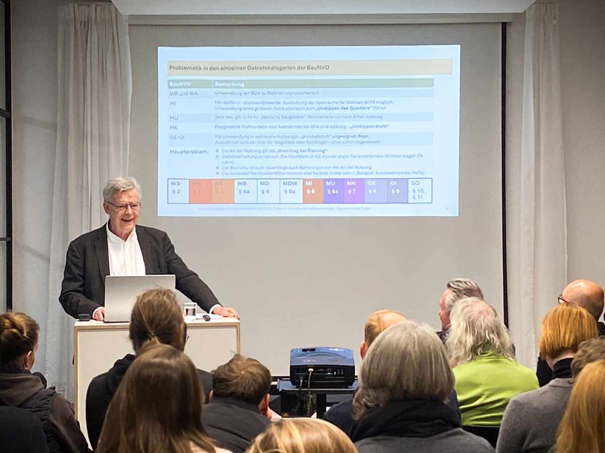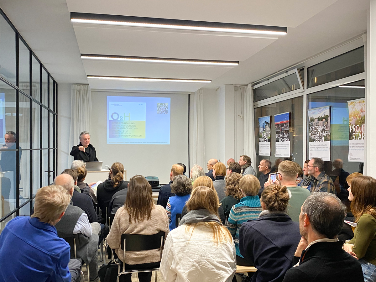 Die Kooperations-Veranstaltung der mitbauzentrale zusammen mit dem BDA Bayern am 19.11.2025 war bis auf den letzten Platz gefüllt. Die Autoren der Handreichung Office2Housing – Prof. Dr. Rudolf Hierl, Cornelius Mager und Rainer Hoffmann vom Bund Deutscher Architekten – stellten vor, welche Chancen im Umbau von Bürogebäuden zu Wohnungen liegen, welche baulichen Voraussetzungen erfüllt sein müssen und worauf bei der Projektentwicklung besonders zu achten ist.